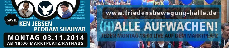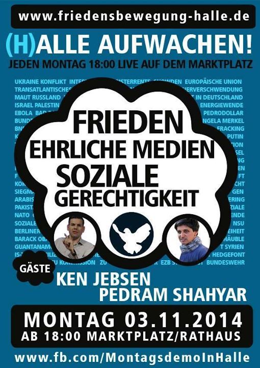 Das freut einige Leser und Friedensaktivisten, aber es lässt auch die lokalen Gegner der Friedensbewegung anschwellen: Ken Jebsen, Journalist und Betreiber von KenFM und Pedram Shahyar (ehemaliger Attac-Aktivist) kommen am 03.11. nach Halle und sprechen dort.