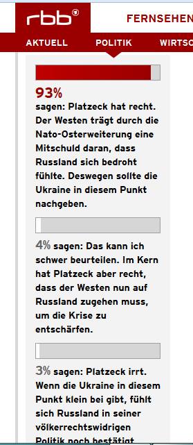 Es gab eine Umfrage, des RBB nach der 93 Prozent der Befragten meinten, Platzeck habe Recht, dass der Westen die Schuld an der Nato-Osterweiterung trägt und damit Russland bedroht. 4 Prozent meinten, dass er im Kern Recht hat und nur 3 Prozent, also nochmal in Worten: nur drei von Hundert glauben der Nato-Propaganda und meinen, dass Platzeck irrt.