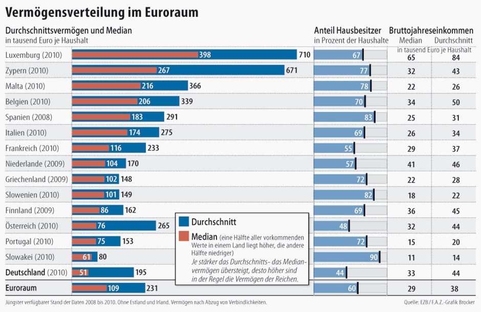Warum wundert das jetzt viele Leser? Zum einen war nicht jedem bewusst, dass es in Deutschland viel weniger Hausbesitzer als in den anderen Ländern der Eurozone gibt. Zum Anderen arbeiten unsere auf Erfolg getrimmte Politiker, die Staatsmedien und die Nato-Propaganda-Presse gerne mit dem Durchschnittswerten. Diese werden aber durch sehr hohe Ausreißer verzerrt. So bringen die Superreichen das gehörig durcheinander, von denen gleich nach den USA die meisten in Deutschland leben. Der Median sortiert aber die Vermögen und wählt den Wert in der Mitte aus. Extremwerte verzerren dieses Maß nicht. Es zeigt damit, welches Vermögen die Mehrheit der Menschen in Deutschland hat. Und die Mehrheit hat weniger als die Mehrheit in jedem anderen Euroland.