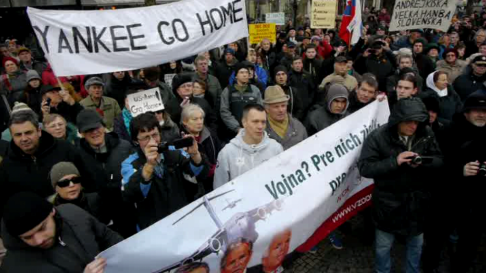 In Bratislava demonstrierten ca. 500 Leute mit den gleichen Symbolen und Schriftzügen wie in Venezuela gegen die USA und die NATO direkt vor der US-Botschaft.