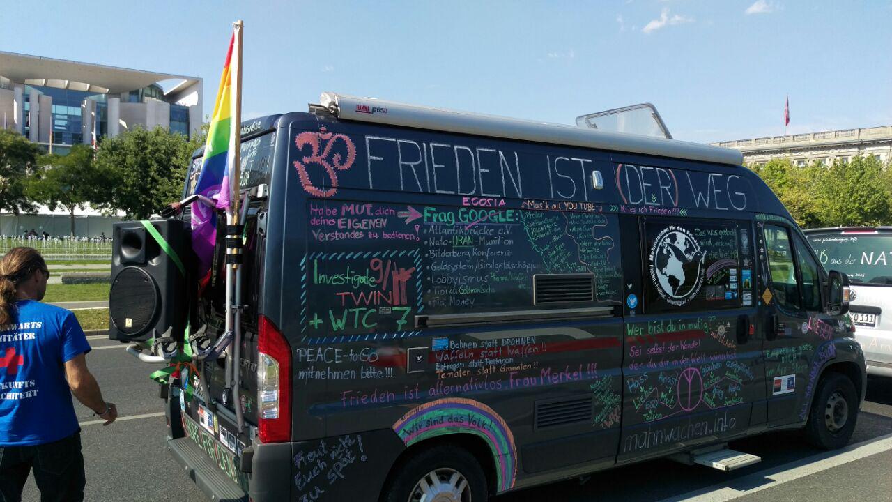 Am 29. August gab es gleich 2 Veranstaltungen der Friedensaktivisten in Deutschland. Eine Gruppe von Teilnehmern aus verschiedenen Städten fuhr im Konvoi von ca. 10-15 Fahrzeugen durch mehrere Städte mit 2 Zwischenstopps auf großen Parkplätzen, wo Live-Musik gespielt und Menschen informiert wurden. Dabei war jedes der Fahrzeuge informativ bemalt oder beschriftet. Das Ziel das Konvois war die 3. bundesweite Mahnwache in Berlin am Potsdamer Platz.